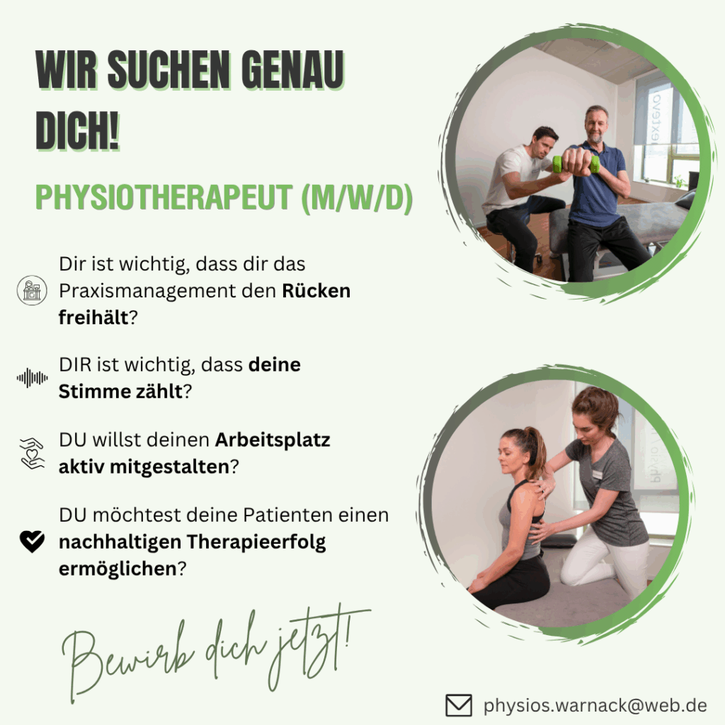 Wir suchen motivierte Physiotherapeuten, Trainer und duale Studenten, die unsere Leidenschaft für Gesundheit und Bewegung teilen. Bei uns hast Du die Chance, Dich weiterzuentwickeln und in einem engagierten Team zu arbeiten.